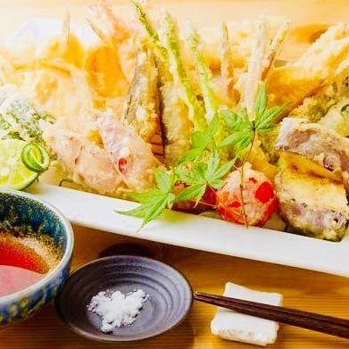 天ぷら、1個からご注文OK!王道の大海老・かぼちゃ・鶏ももはもちろん、当店オリジナル「カマンベールチーズ」「ジャガバター塩辛のせ」も大人気商品♪お酒と相性抜群で一度食べたらやみつき、箸が止まりません・・・【飲み放題のみプラン1,780円+お好きな天ぷら】コンビがオススメ◎盛り合わせもご用意しますのでどうぞ♪